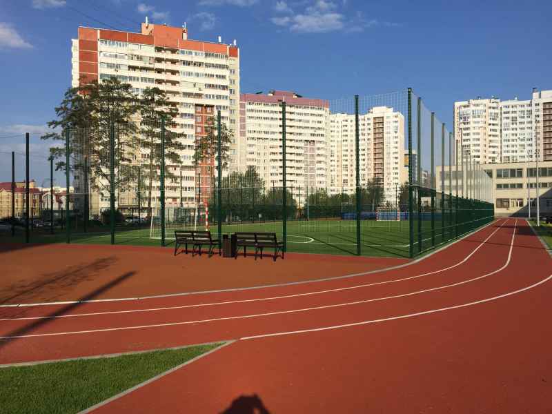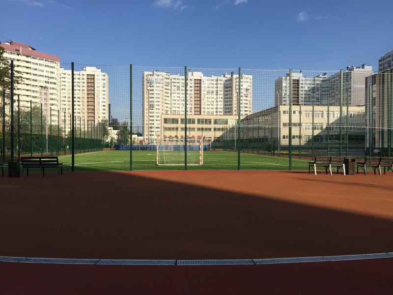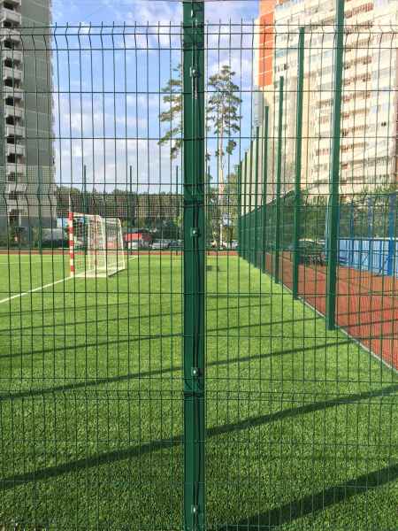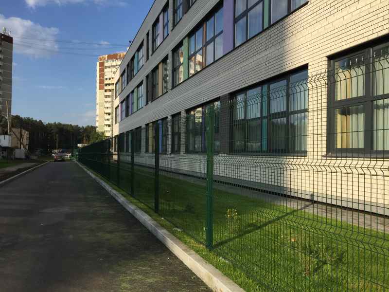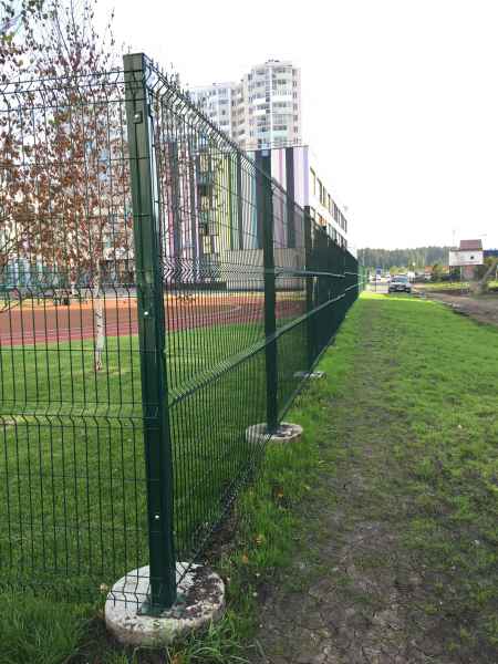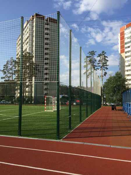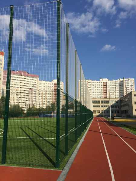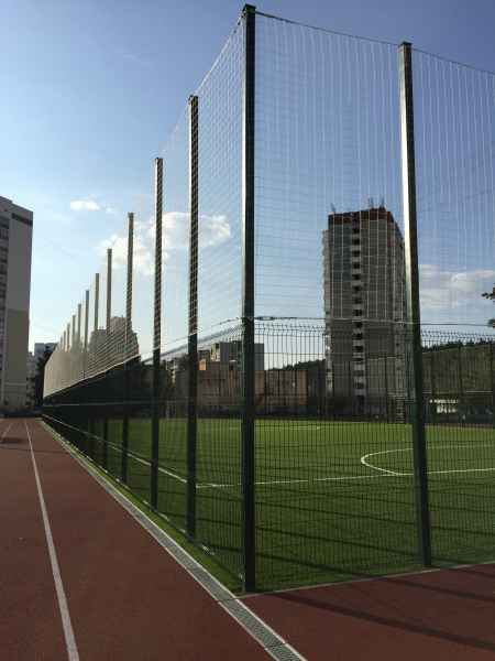 Установка основного ограждения школы, а также установка ограждения внутри территории для футбольной площадки. В качестве основного ограждения были выбраны панели с характеристиками 2030х3000, у спортивной площадки для игры в футбол панели 2430х3000 с последующим навешиванием полипропиленовой сетки препятствующей вылета мяча за пределы площадки.