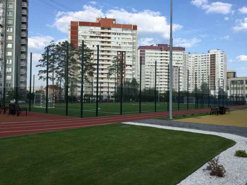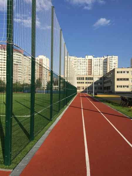 Установка основного ограждения школы, а также установка ограждения внутри территории для футбольной площадки. В качестве основного ограждения были выбраны панели с характеристиками 2030х3000, у спортивной площадки для игры в футбол панели 2430х3000 с последующим навешиванием полипропиленовой сетки препятствующей вылета мяча за пределы площадки.