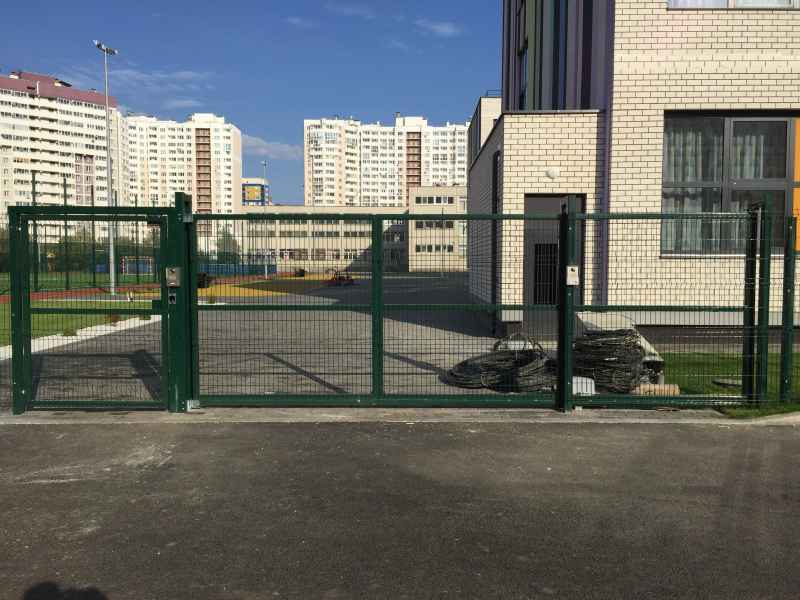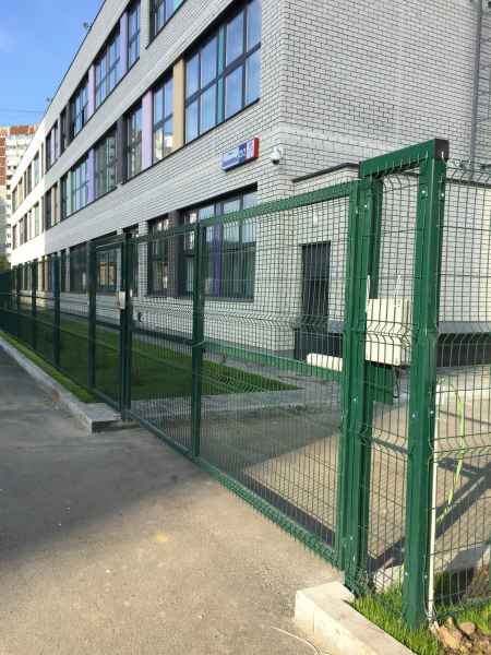 Установка основного ограждения школы, а также установка ограждения внутри территории для футбольной площадки. В качестве основного ограждения были выбраны панели с характеристиками 2030х3000, у спортивной площадки для игры в футбол панели 2430х3000 с последующим навешиванием полипропиленовой сетки препятствующей вылета мяча за пределы площадки. Опоры устанавливались по принципу фланцевого соединения анкерами в подготовленное бетонное основание. В периметр встроены калитки и ворота, распашные и откатные, выполненные в едином решении с ограждением. Монтаж осуществлялся силами заказчика.